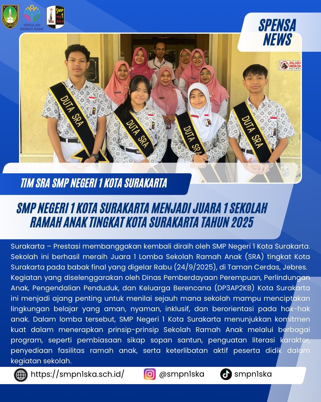 SMP NEGERI 1 KOTA SURAKARTA MENJADI JUARA 1 SEKOLAH RAMAH ANAK TINGKAT KOTA SURAKARTA TAHUN 2025